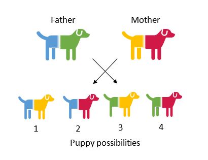 Figure 1: A graphic representation of inheritance, with each colour representing the portion of genetic material inherited from the mother and father, respectively. Each puppy will have a 1 in 4 chance of having a certain genetic possibility.