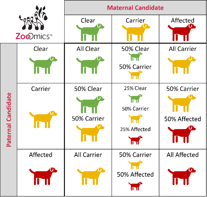 The genetic mutations that are responsible for health problems are inherited from the parents. These mutations have dominant and recessive alleles or variants. The dominant variants are phenotypically expressed (these are the physical traits you will see, i.e., coat colour) whether they are homozygous dominant (they have two dominant alleles) or heterozygous (they have one dominant and one recessive allele). The recessive variants are only phenotypically expressed when both variants are recessive. This means that if both the parents carry the recessive allele, they won’t show any signs or symptoms of having the health issue but can pass on two copies of the recessive allele (one from each) and have offspring that are affected.
